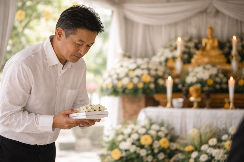 タイは仏教国で、お寺での葬儀が一般的です。僧侶が読経し、故人の魂が次の世へちゃんと旅立てるように祈る、という流れは日本と似ています。