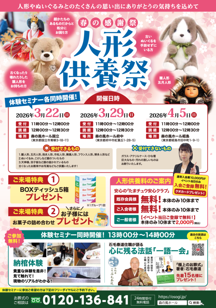 森の風ホール国立で毎年人気を集めている人形供養祭、今年は3月22日に開催いたします。お誘いあわせの上、ぜひご来場ください!