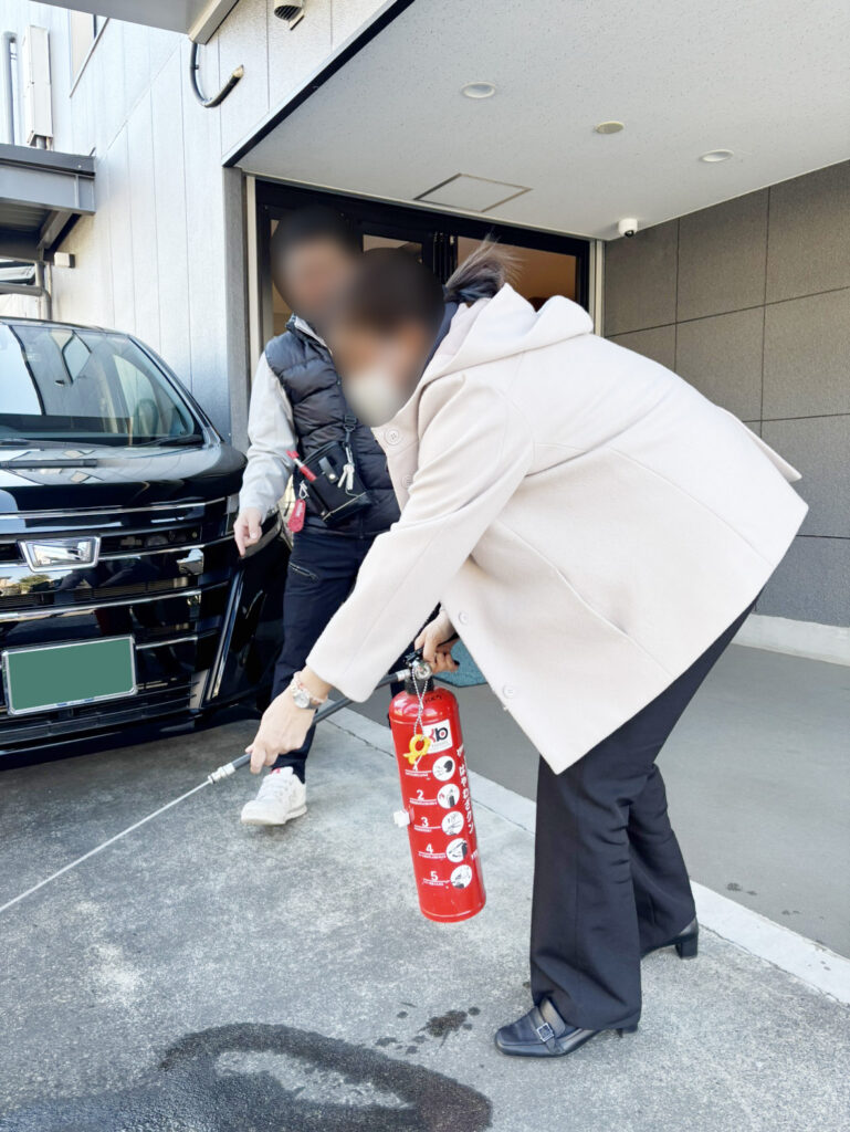 続いて、消火器が正常に作動するかの点検と消火器の使い方をレクチャーいただきました。
