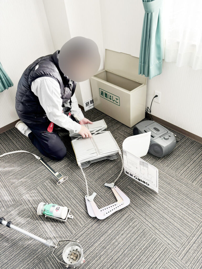 まずは、各階に設置されている火災報知器と3階に設置されている避難はしごの点検を実施しました。