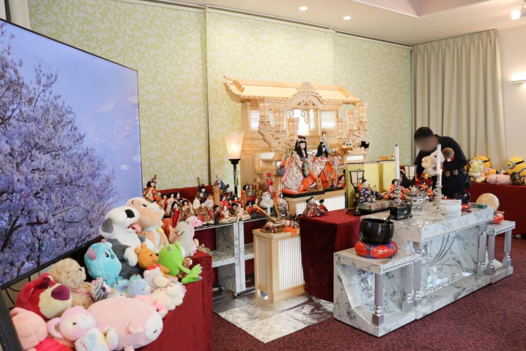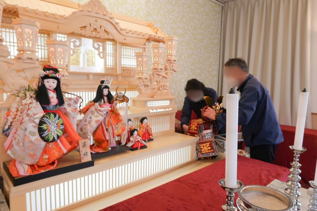 写真はスタッフが兜やぬいぐるみを並べている様子です。並べた後に写真を撮ったり、お線香をお手向けしたりされるお客様も多くいらっしゃいました。