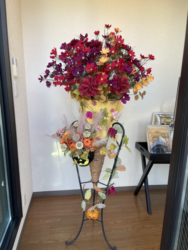 家族葬ホール「森の風ホール府中」のエントランスが、ほっこりとした温もりをたたえた秋の装い・ハロウィンへと変わりました。